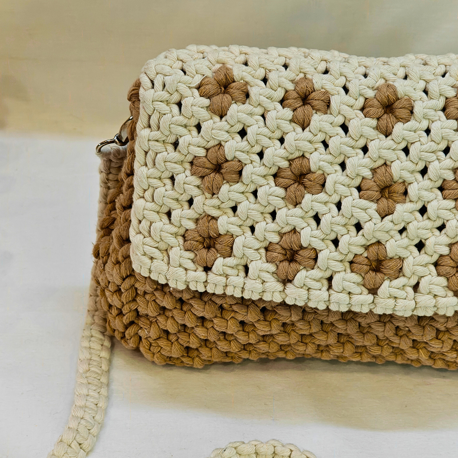 charming hand-crafted sling bag in earthy beige and cream tones, crafted with textured cords for a rustic yet elegant finish. Lightweight, stylish, and perfect for your everyday essentials.