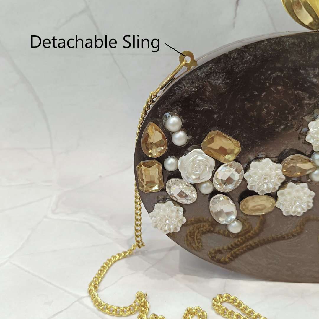 The Allure Éclat Clutch features shimmering resin artistry, combining elegance and spacious design for any chic occasion.
