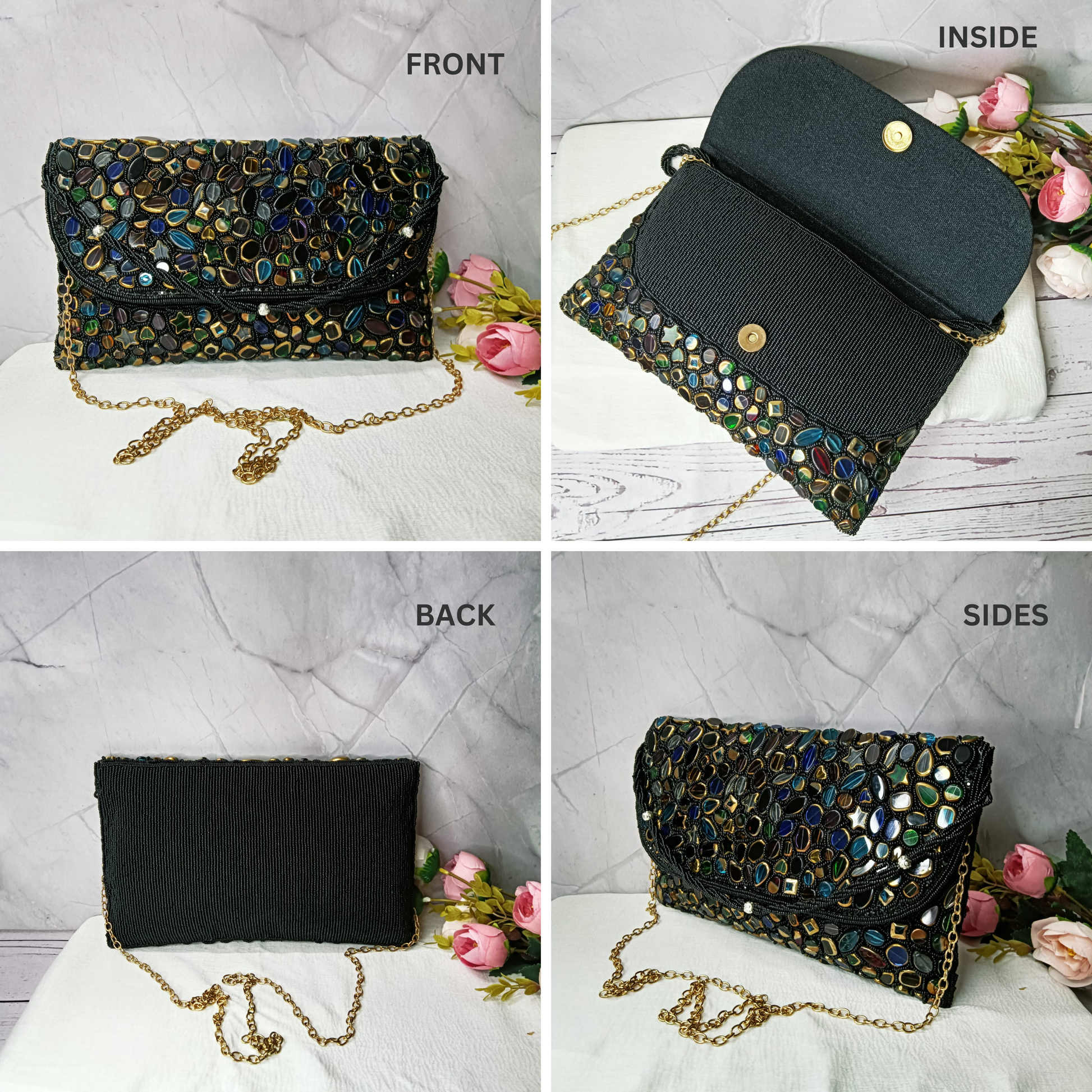This is handmade and is a combination of traditional and modern Beads embroidery work. Large storage capacity which easily carries your essentials like a mobile phone, cards, cash, car keys, small wallet, mirror, lipstick and some makeup. It is an ideal choice for all evening occasions. Avoid contact with water or extreme heat, You can use wet neutral-colored cloth to wipe clean it