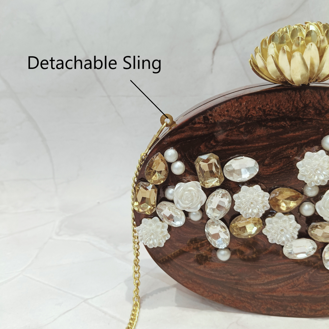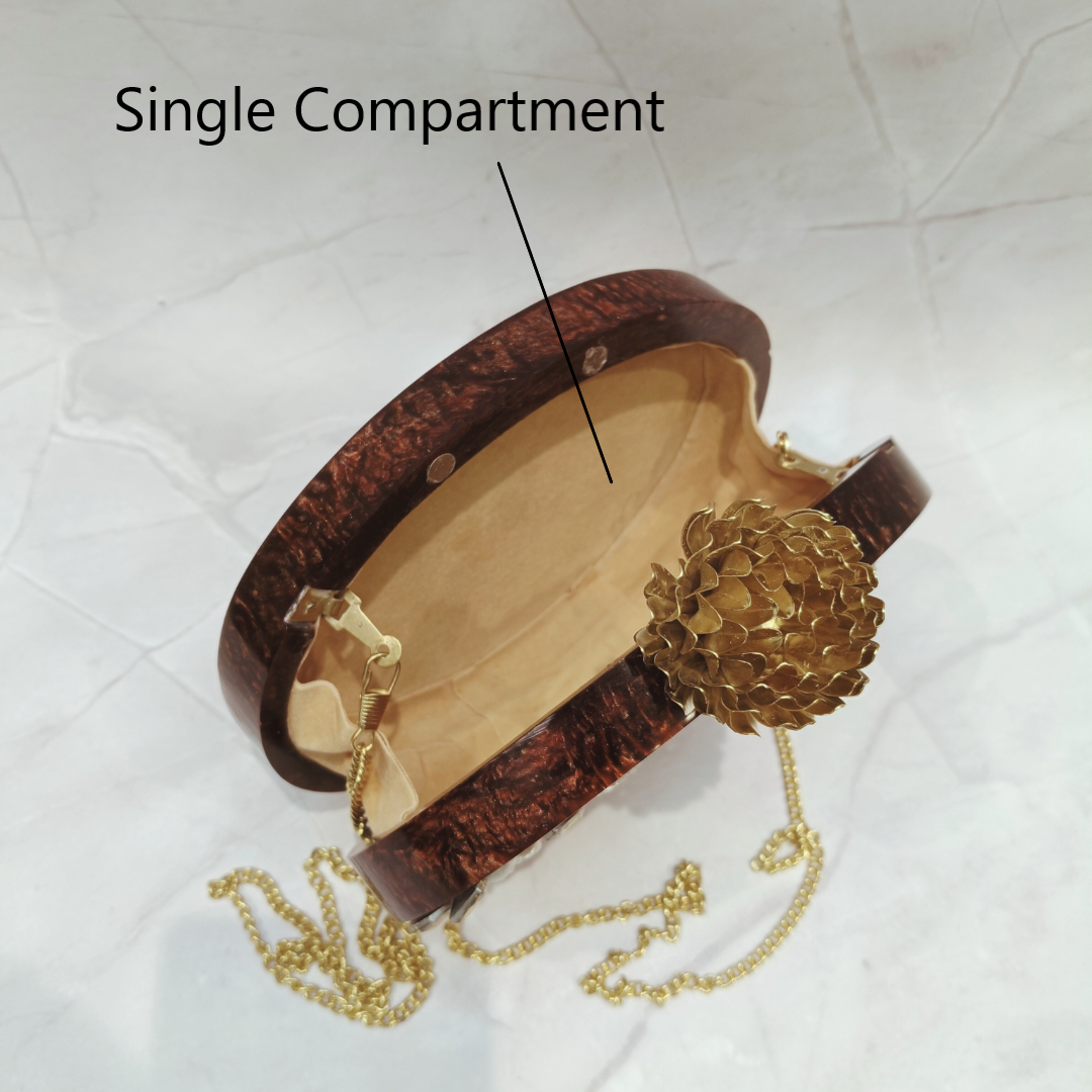 The Allure Éclat Clutch features shimmering resin artistry, combining elegance and spacious design for any chic occasion.