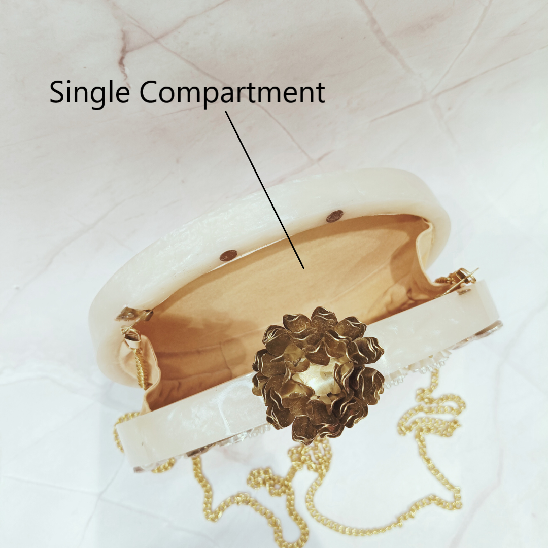 The Allure Éclat Clutch features shimmering resin artistry, combining elegance and spacious design for any chic occasion.