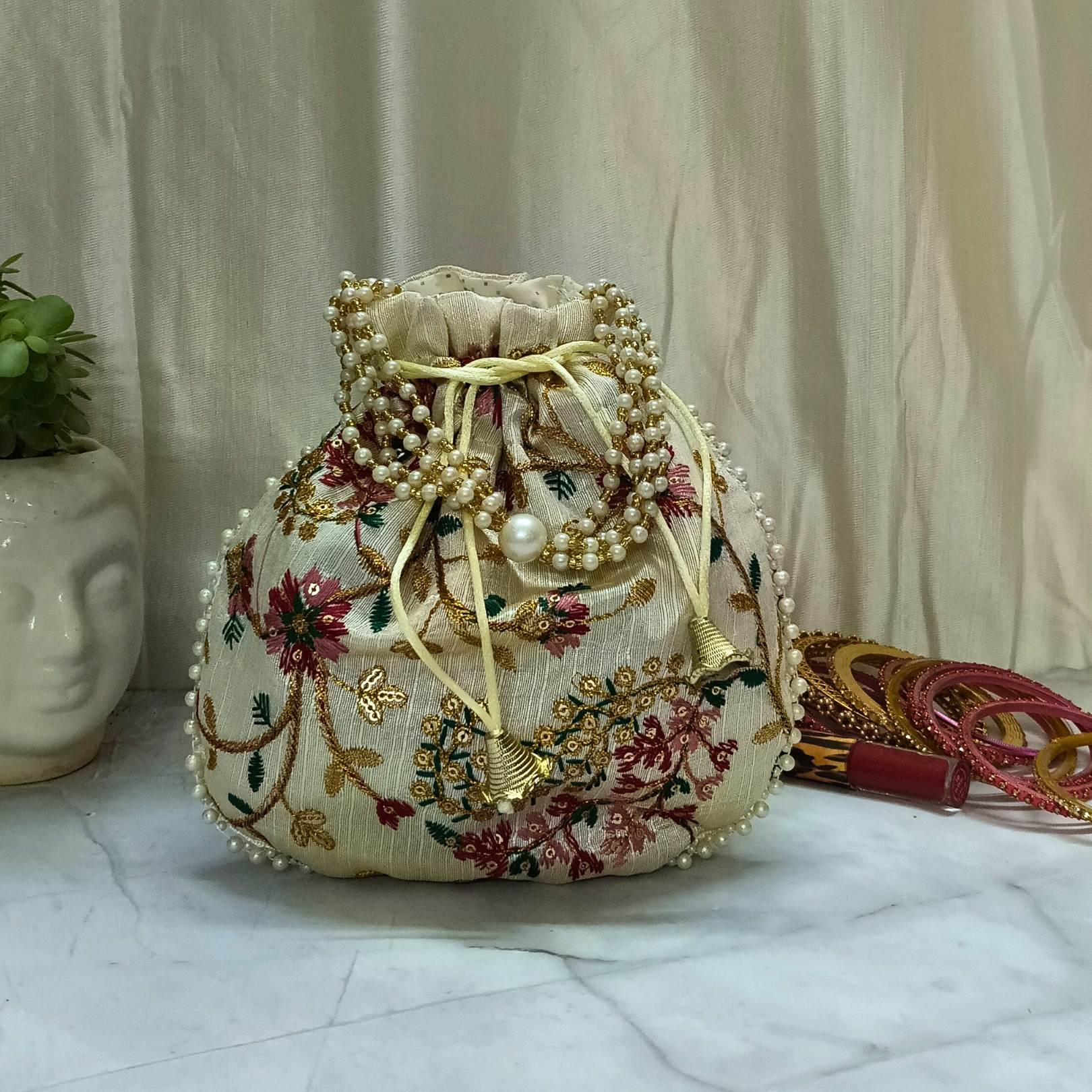 Elegant embroidered potli bag with pearl tassels – perfect for weddings, parties, and festive occasions.