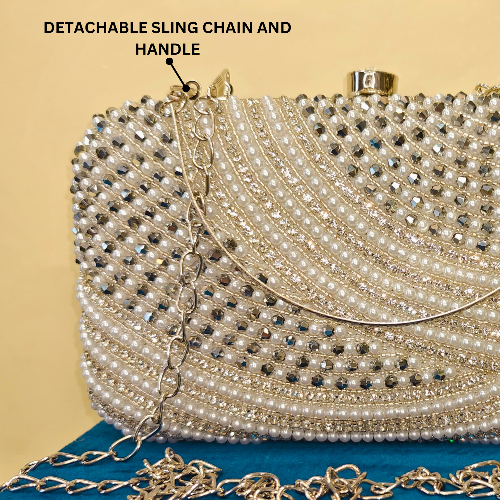Exquisite Silver Pearl Box Clutch, blending timeless elegance with modern sophistication for any occasion.
